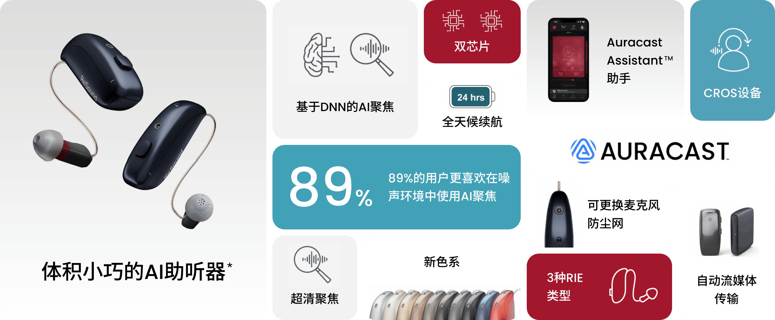 秉持以人为本,AI精准赋能,为听觉系统提供清晰声音信息,助力提升自然听觉体验与言语聚焦能力,优化您在嘈杂环境下的聆听感受1-4 结合 AI 聚焦与净噪系统,小体积高效能,轻松展现优异性能